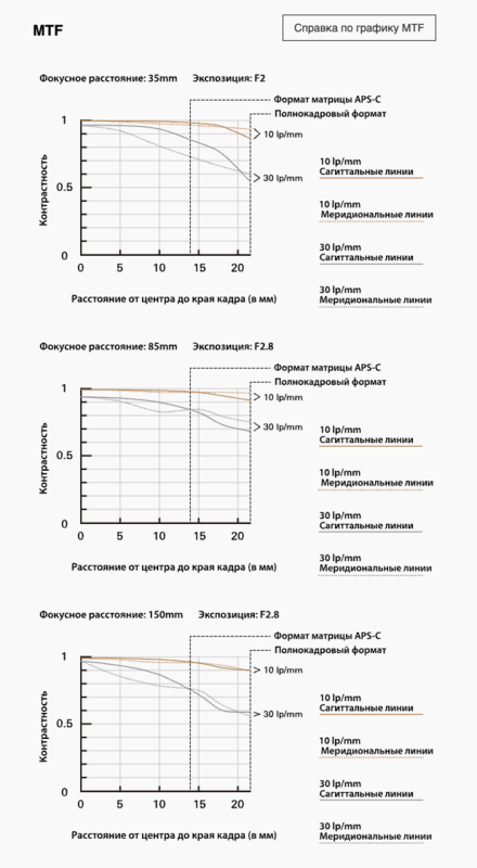 Производительность объективов различается в зависимости от направлений. Непрерывные линии показывают производительность в сагиттальном (радиальном) направлении, а линии в виде точек — в круговом (меридиональном) направлении. При тестировании объективов, обеспечивающих высокую резкость с одними и теми же оптическими характеристиками по всему полю изображения, графики ЧКХ выглядят сбалансировано.
