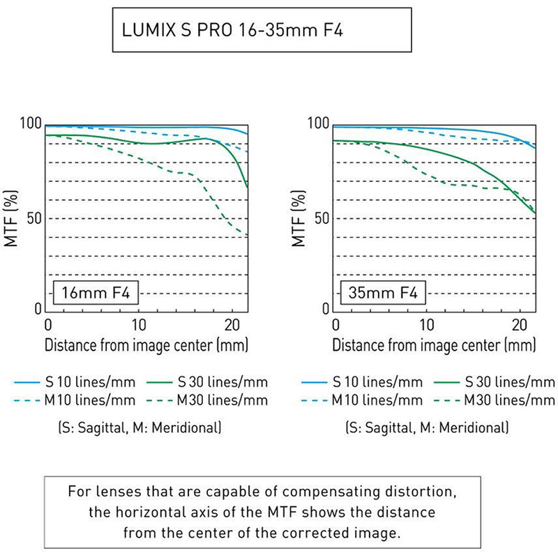 Для объективов с функцией компенсации дисторсии горизонтальная ось диаграммы MTF показывает расстояние от середины исправленного изображения.