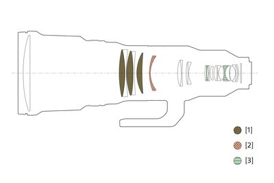 [1] Флюоритовый объектив [2] Асферическая линза типа XA [3] сверхнизкодисперсионное стекло