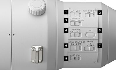 1. Кольцо фокусировки / 2. Кольцо выбора функций / 3. Уплотняющее кольцо штатива / 4. Кнопка удержания фокусировки / 5. Держатель фильтра типа drop-in / 6. Проушина для крепления ремня / 7. Щелчковый переключатель на уплотняющем кольце штатива / 8. Разъем для защитного замка (возможность использования защитного тросика)