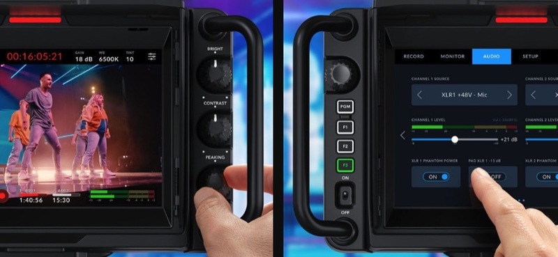 Камеры Blackmagic Studio оснащены физическими кнопками и ручками, а также элементами управления на сенсорном экране. Ручки на правой стороне камеры позволяют регулировать яркость, контрастность и пиковую фокусировку. Ручка фокусировки невероятно полезна, поскольку позволяет точно настроить выделение деталей, чтобы получить идеальную фокусировку при масштабировании. Трем функциональным кнопкам слева можно назначить функции, такие как зебра, искусственный цвет, выделение пиков фокуса, LUT и многое другое! Кроме того, вы можете изменить функцию, назначенную каждой кнопке в меню. Сенсорный экран также включает в себя проекционный дисплей с самой важной информацией о съемке, а также меню для всех настроек камеры, LUT и пользовательских настроек.