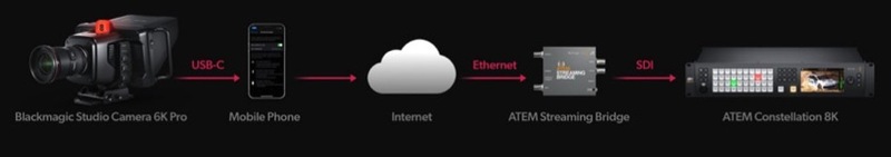 Теперь вы можете размещать камеры удаленно, в любой точке мира, поскольку модели Blackmagic Studio Camera 4K Pro G2 и 6K Pro имеют встроенную функцию прямой трансляции! Это означает, что вы можете разместить камеру в удаленном месте, и она сможет генерировать прямой поток H.264 HD, который отправляется через Интернет обратно в студию. Просто подключите камеру к Интернету с помощью встроенного соединения Ethernet или подключите телефон 4G или 5G к порту USB-C для потоковой передачи удаленных данных! Прямая трансляция принимается в студии с помощью потокового моста ATEM, где она преобразуется обратно в видео для подключения к коммутатору. ATEM Streaming Bridge может даже отправлять данные, двустороннюю связь и управление камерой обратно на камеру!